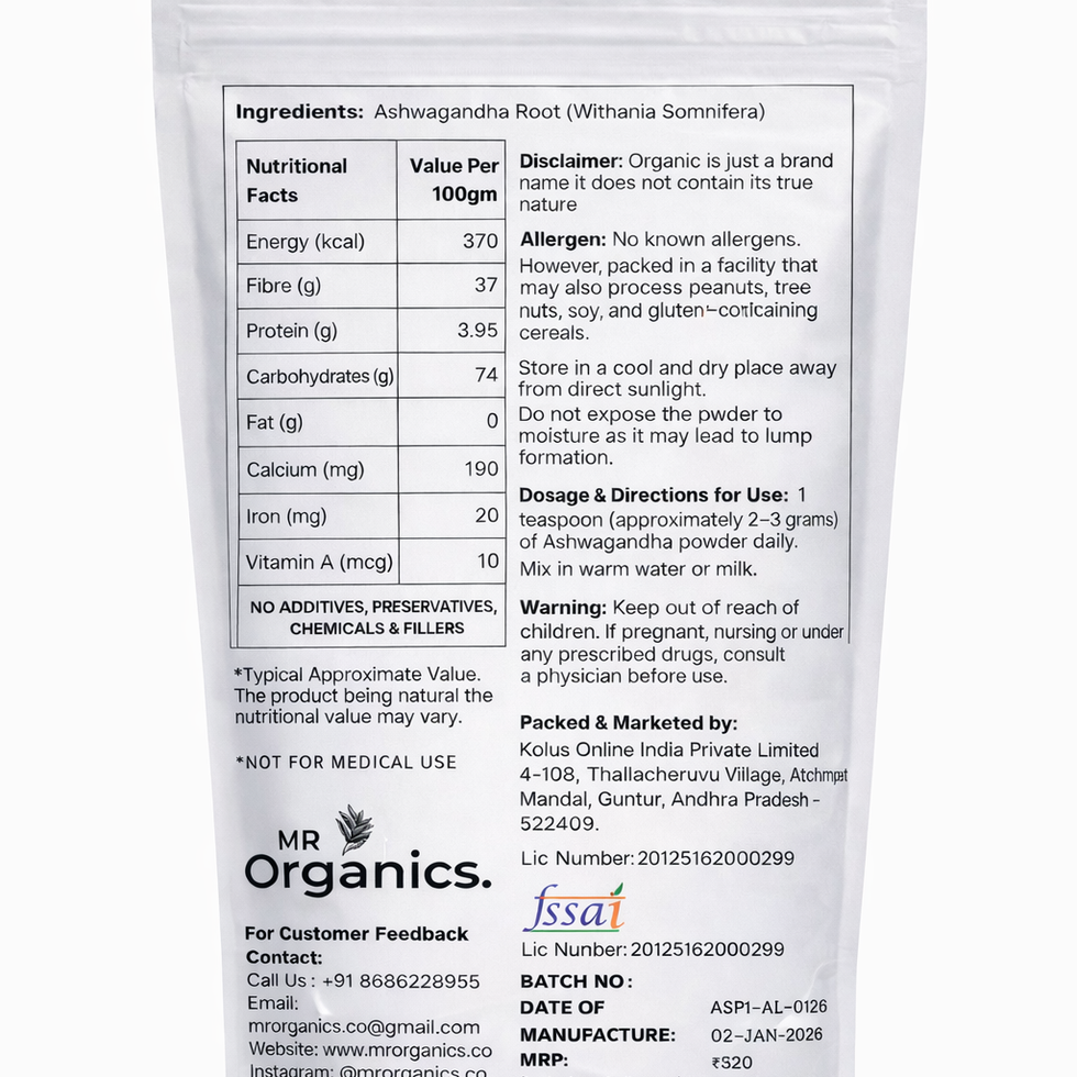 MR Organics Ashwagandha Powder is made from carefully selected Ashwagandha roots and ground into a fine powder to maintain its natural quality. We focus on keeping things simple. No additives, no preservatives, and no unnecessary processing.